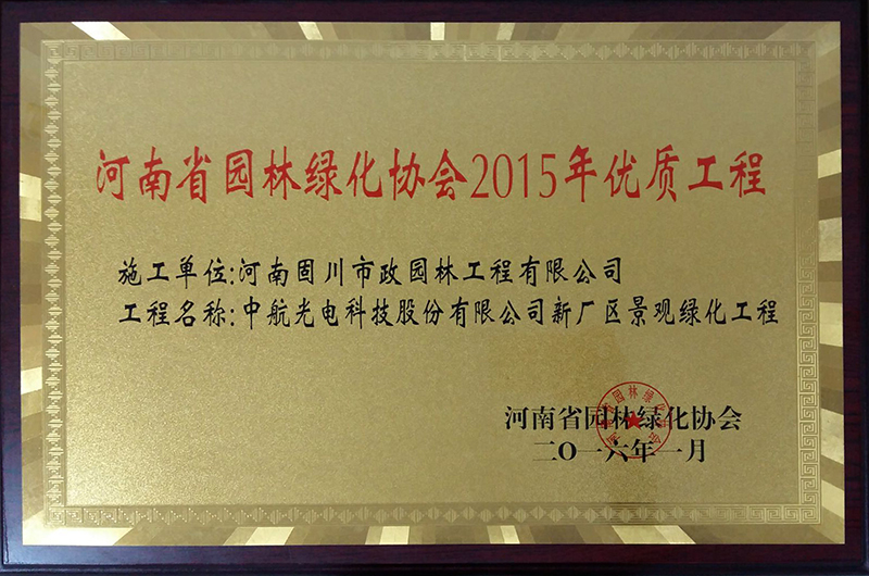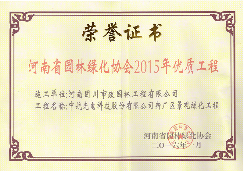 2016年1月河南省園林綠化協會頒發的河南省園林綠化協會2015年優質工程