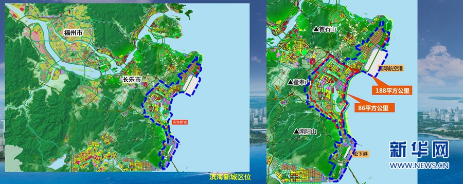 福州濱海新城位于長樂沿海地區,首石山、董奉山、南陽山三山環抱,面積188平方公里,北含國際航空港,南接松下港,面向東海,規劃人口130萬人,其中核心區面積86平方公里。
