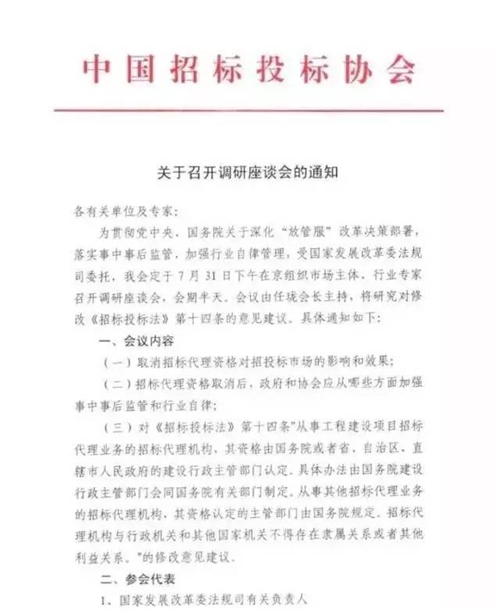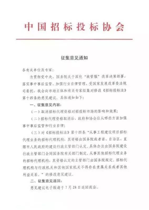 7月31日,受國家發改委法規司委托,中國招標投標協會將組織市場主體、業內專家學者,就《招標投標法》第十四條關于工程招標代理機構資質管理的條款修訂收集意見。